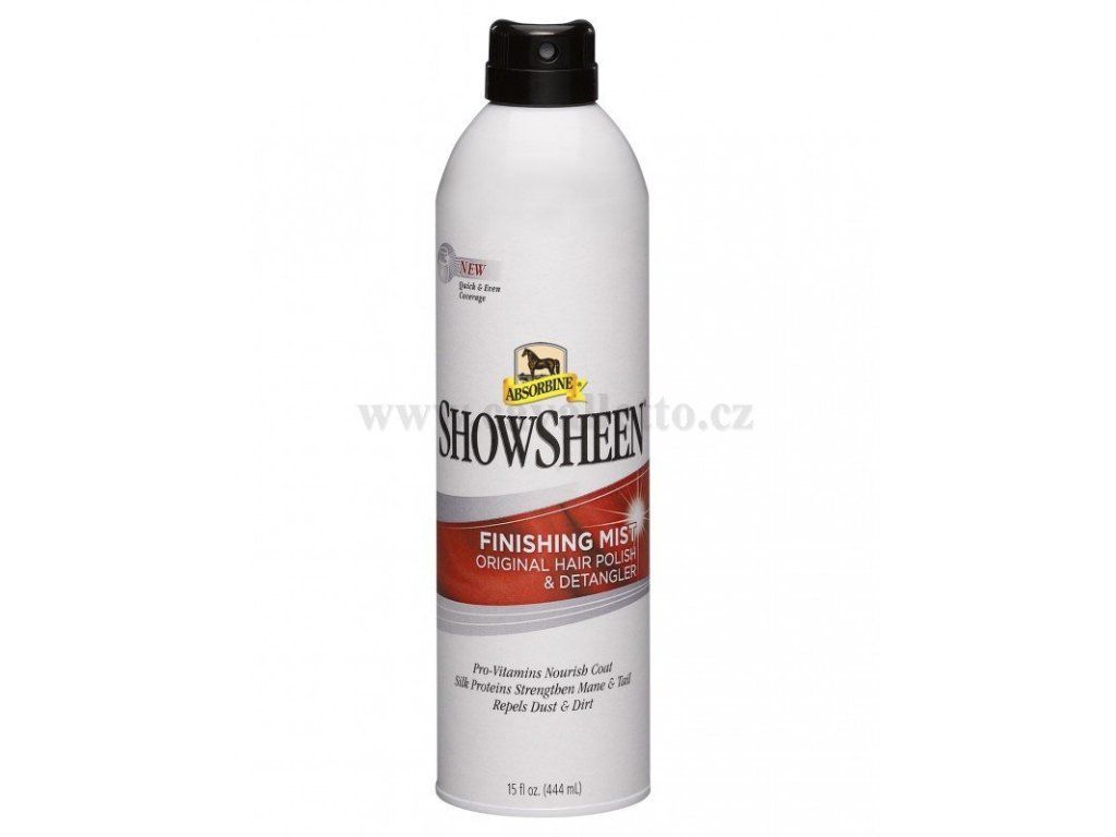 Absorbine ShowSheen Lesk- sprej pro finální úpravu je unikátní lesk ve spreji, vyvinutý tak, aby přinášel nesrovnatelnou pomoc při péči o srst, hřívu i ocas koně. Unikátní, lehká mlha dle léty osvědčené receptury jemně obaluje každý chloupek či žíni koně tak, aby byly lehce rozčesatelné, a zároveň její vyživující složka zamezuje efektu elektrizovaných, rozlétaných žíní.