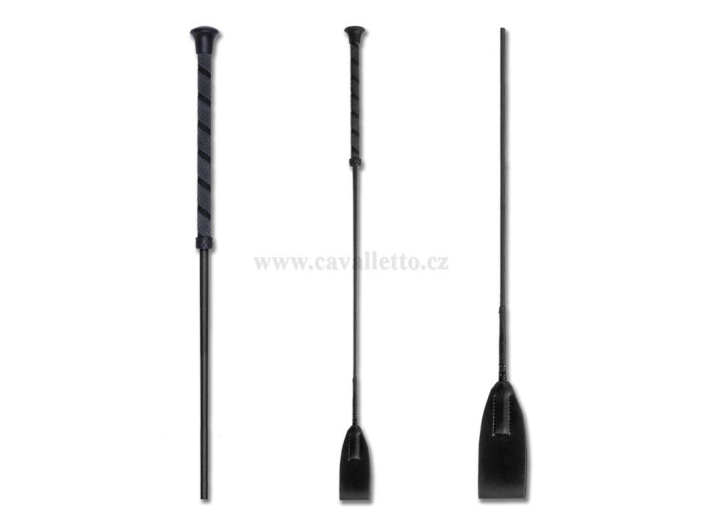 Bičík s šedou protiskluzovou rukojetí z gumy. S širokým tlesknutím.