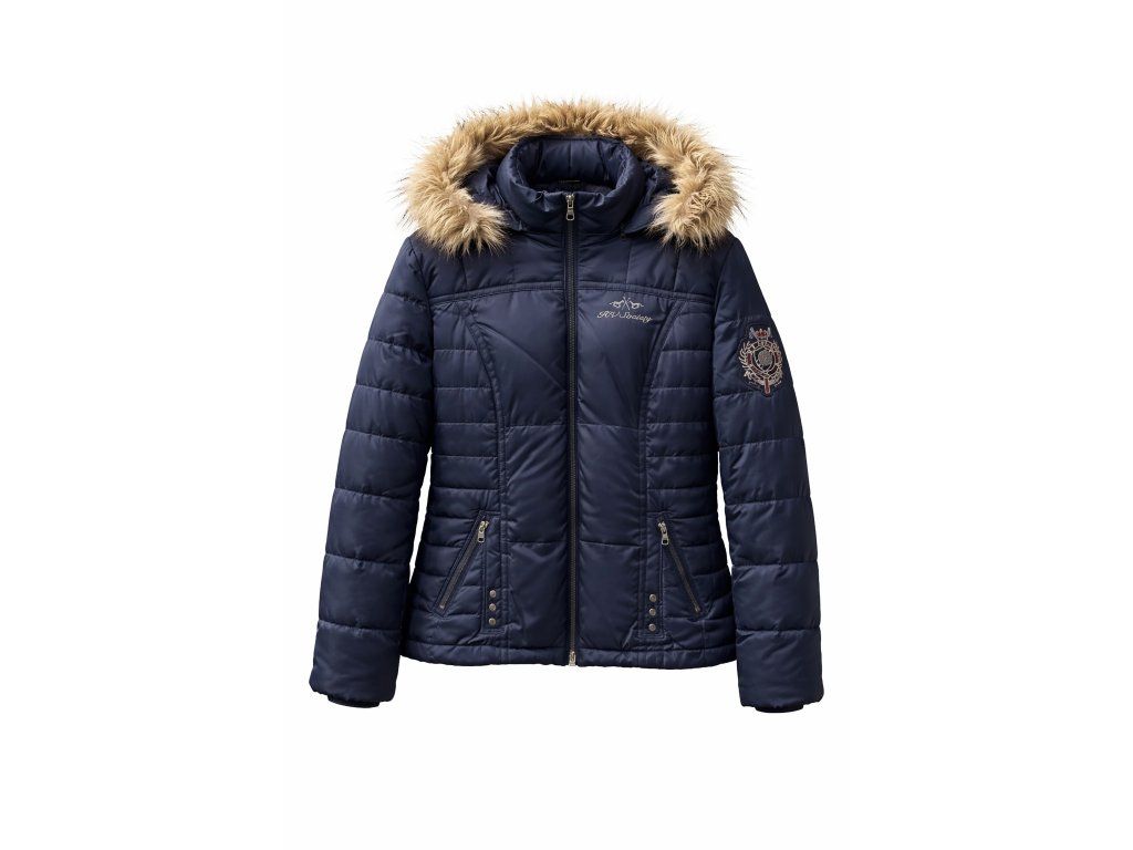 Zimní prošívaná bunda v tmavě modré barvě s kapucí lemovanou umělou kožešinou. Zapínání na zip po celé délce a dvě šikmé kapsy na zip. Na hrudi je jemné logo a na rukávu ozdobná nášivka. Bunda je teplá, elegantní a je vhodná na běžné nošení v chladném počasí.