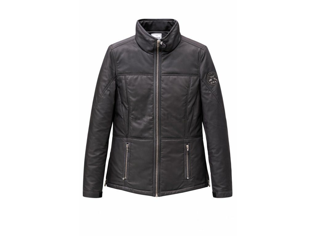 Dámská lesklá jezdecká bunda s vyšším límcem a kapsami na zip.