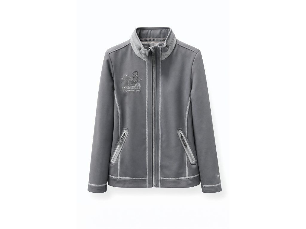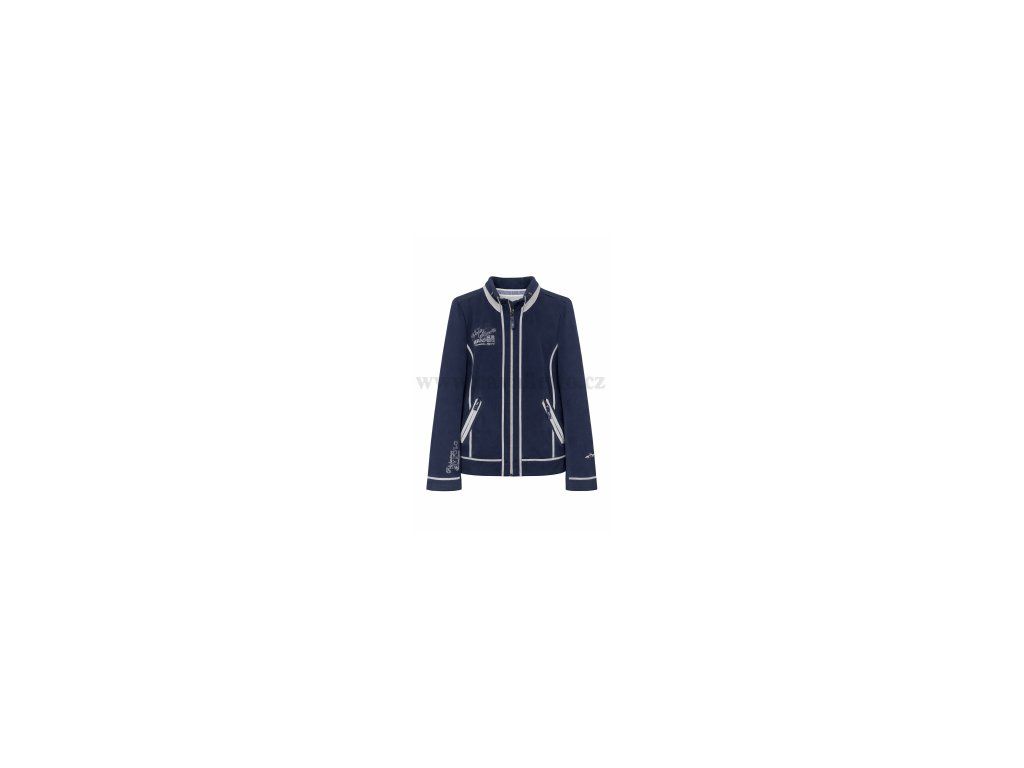 Stylová lehká softshellová bunda s námořnicky modrou barvou a kontrastními světle šedými detaily. Vhodná pro jezdectví i volnočasové nošení. Prodyšný softshell dobře drží tvar a poskytuje komfort při pohybu. Dvě kapsy na zip udrží vše potřebné v bezpečí. Vyšívané motivy na hrudi, rukávu i zádech podtrhují sportovní charakter a moderní vzhled.