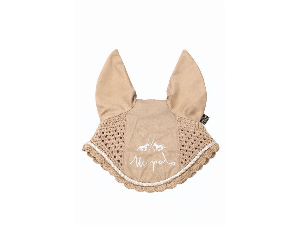 Elegantní jezdecká čabraka v béžovém odstínu s jemným kontrastním zdobením. Kombinuje hladké, elastické ušní části s prodyšnou háčkovanou strukturou pro maximální pohodlí koně. Přední část zdobí decentní výšivka, celkový vzhled doplňuje ozdobný lem po obvodu. Ideální ochrana proti hmyzu se stylovým provedením pro každodenní ježdění i závody.