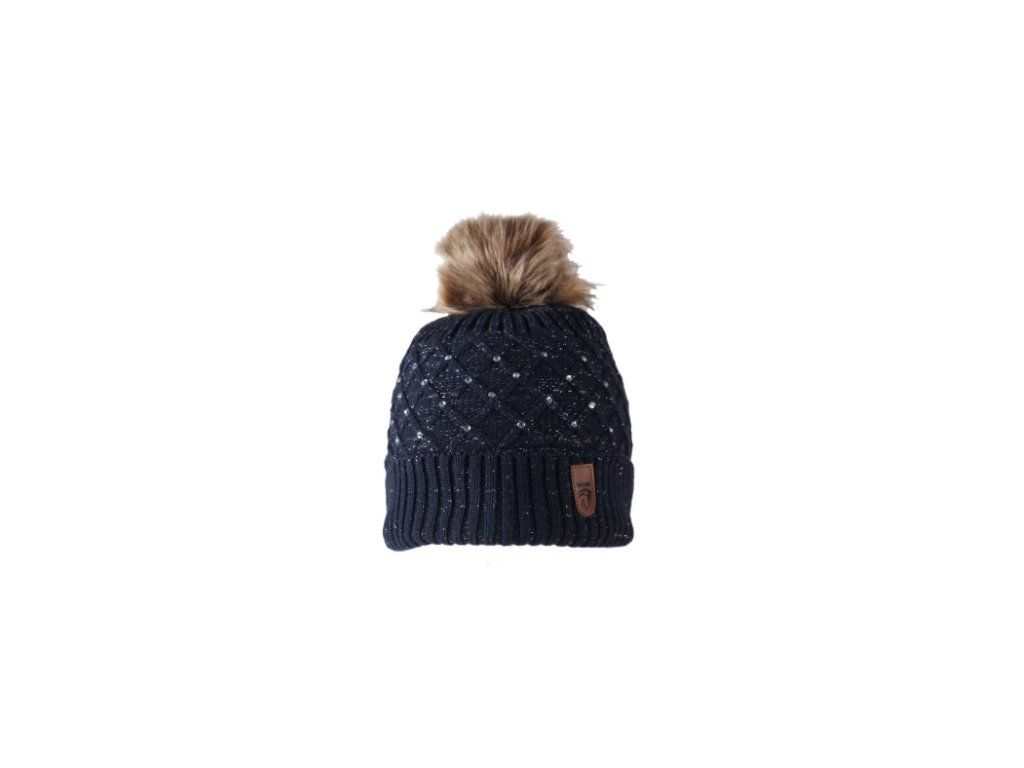 Čepice s fleecovou podšívkou. S lurexem a krystaly, s bambulí z umělé kožešiny.