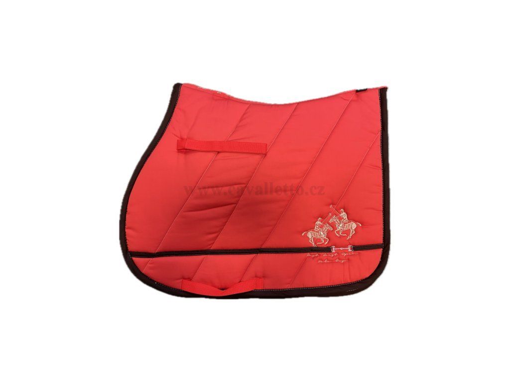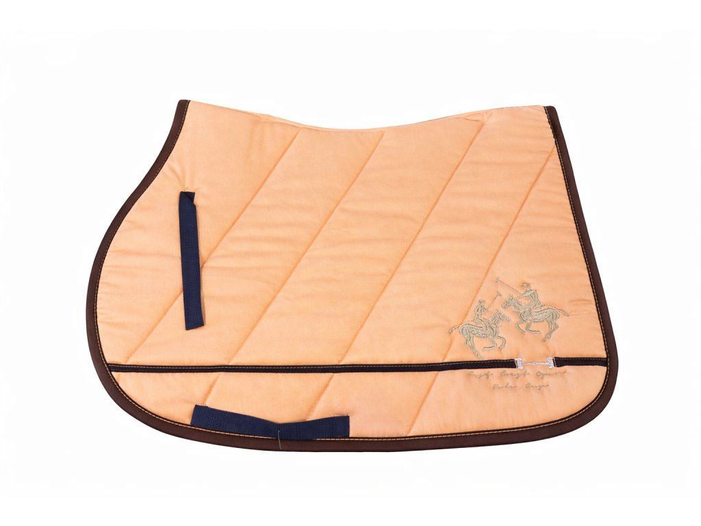 Elegantní jezdecká deka v meruňkové barvě s prošívaným designem a kontrastním hnědým lemováním. Nabízí pohodlí, praktické popruhy a stylový vzhled doplněný decentní výšivkou.
