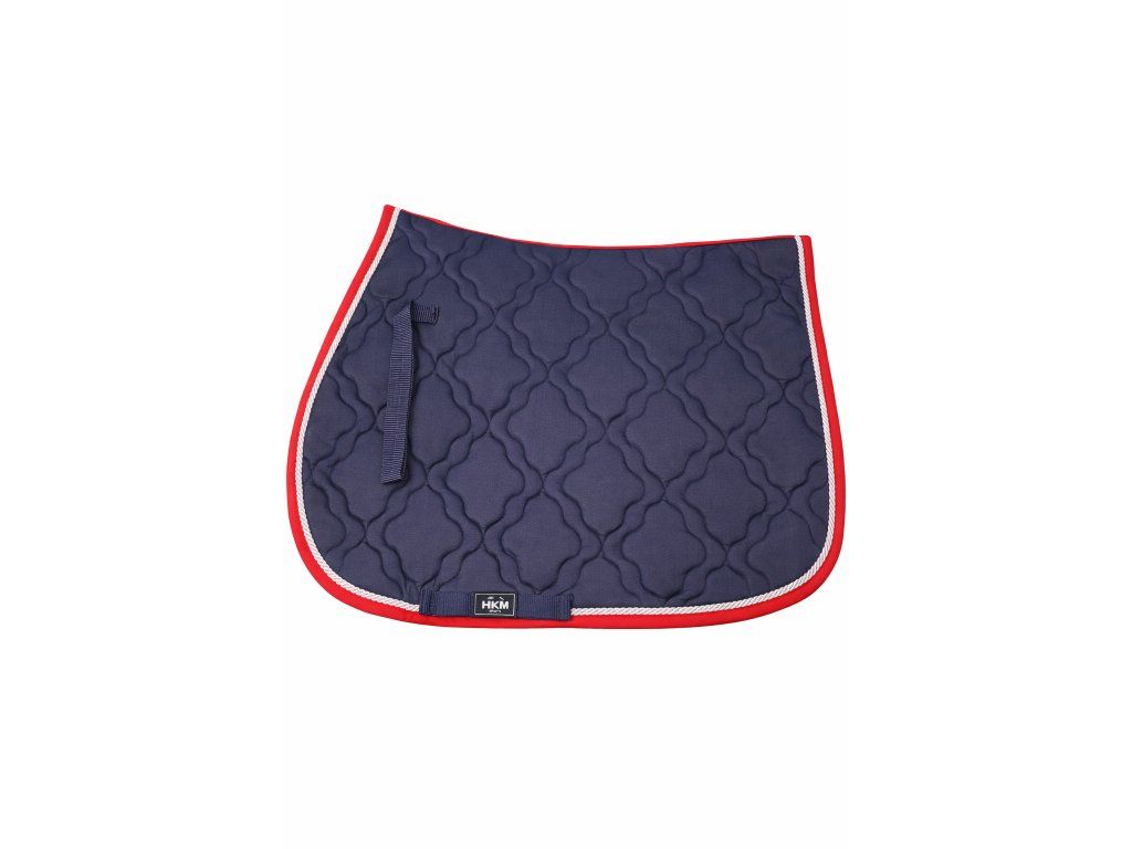 Tmavě modrá podsedlová dečka s elegantním prošíváním a výrazným červeným lemem. Doplněna o světlou šňůrku a praktické popruhy pro snadné uchycení.