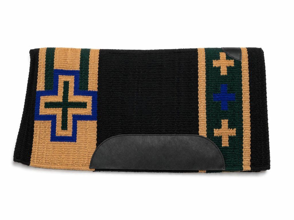 Westernová podsedlová deka s výrazným geometrickým vzorem v přírodních tónech, která zaujme na první pohled svým tradičním designem. Kombinace černé, béžové, zelené a modré barvy vytváří atraktivní kontrast a dodává dece autentický westernový vzhled.
