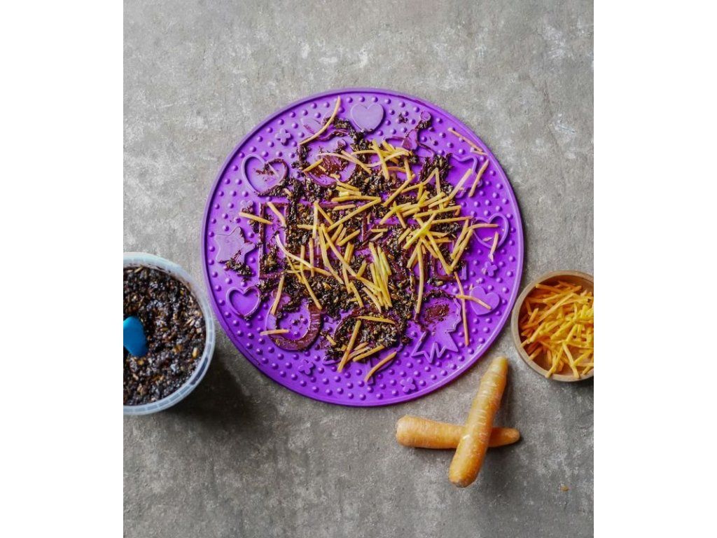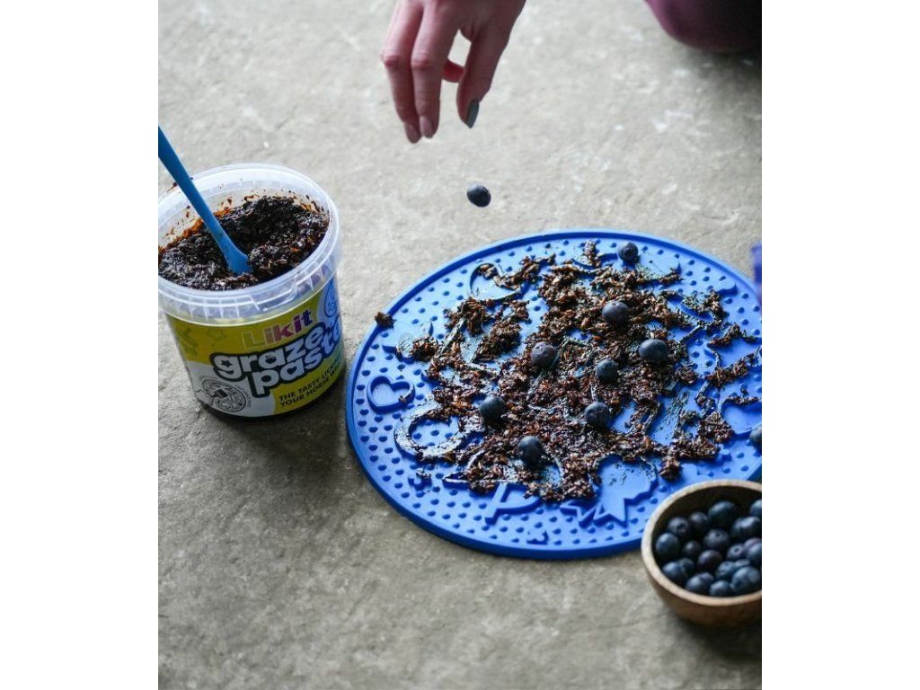 Jednoduše potřete pastou nebo kaší Likit Graze a posypte jídlem, mrkví nebo pamlskem podle potřeby, možnosti různých receptů jsou nekonečné. Případně můžete podložku také vložit do kbelíku na jídlo a použít ji jako pomalý podavač.