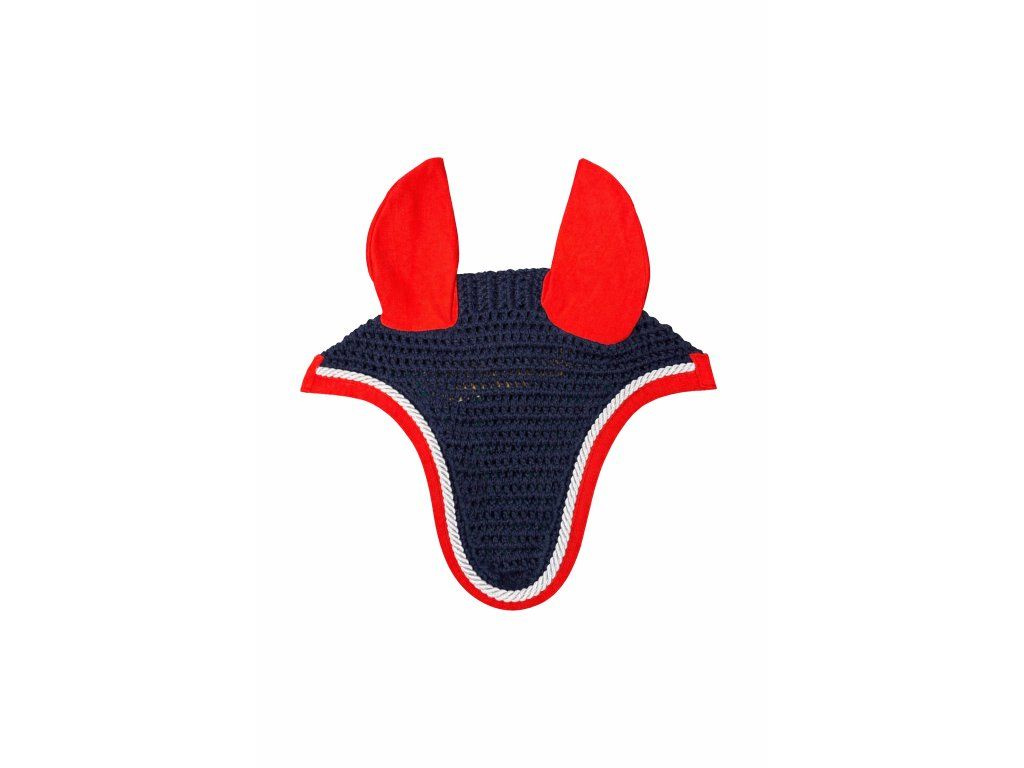 Háčkovaná čabraka v tmavě modré barvě s výraznými červenými ušima a lemem. Doplněna o světlou ozdobnou šňůrku pro elegantní vzhled.