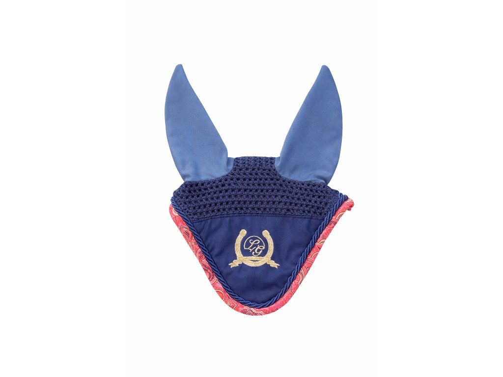 Elegantní čabraka Lauria Garelli v tmavě modrém provedení s jemnými růžovými paisley detaily. Kombinace háčkovyné části a hladkých, pružných uší zajišťuje maximální pohodlí pro koně a účinnou ochranu proti hmyzu i rušivým vlivům. Stylový design doplňuje výrazné zlaté logo značky, které podtrhuje luxusní vzhled. Ideální doplněk k podsedlové dečce ve stejném stylu - perfektní volba pro trénink i závody.