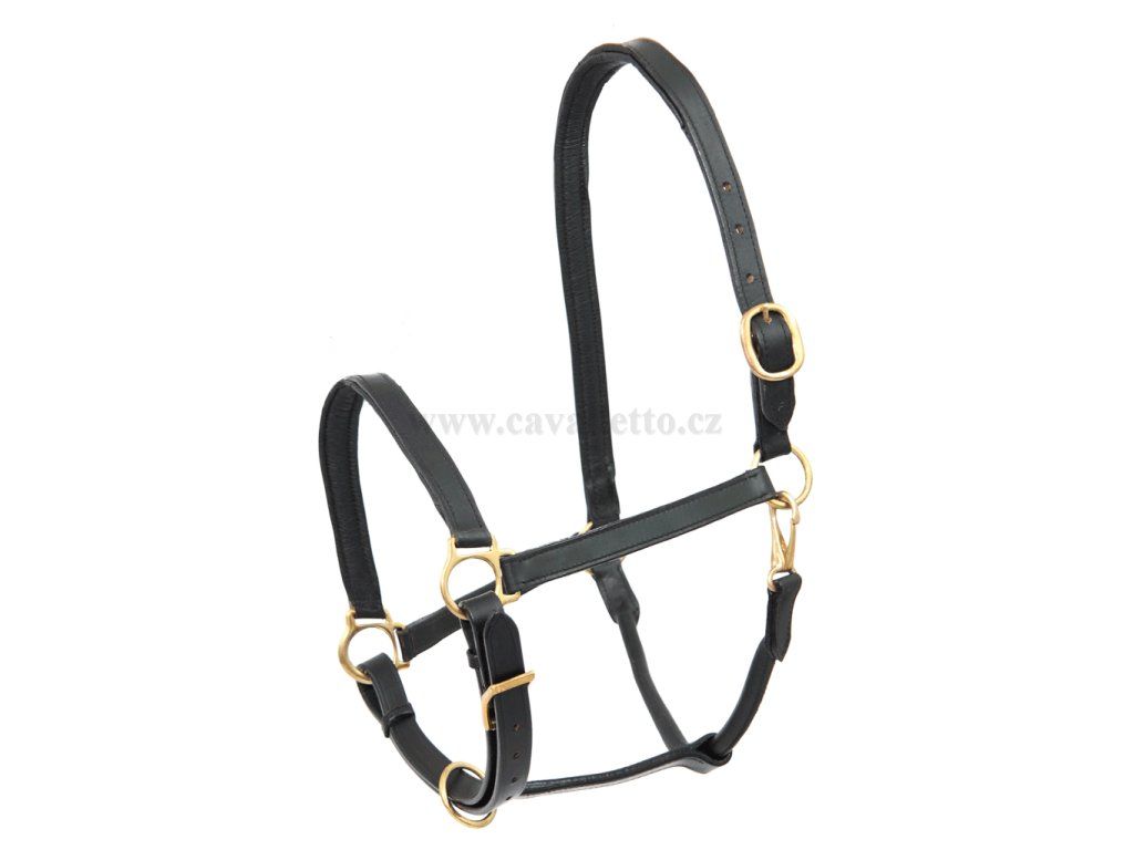 Robustní kožená ohlávka s podloženým nosním páskem a výstřihem. Mosazné kování a vícenásobné nastavení na krku a bradovém popruhu.