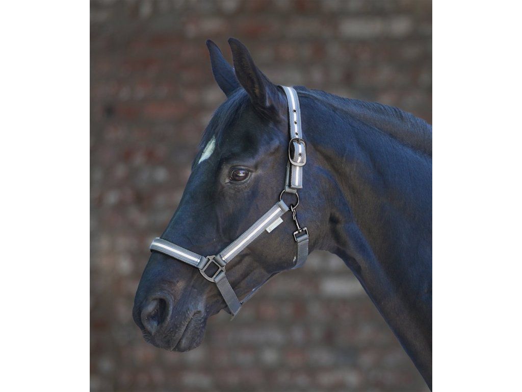 Moderní ohlávka s reflexními pruhy na nosním pásku, lícnici a krku. Kování a čalounění v kontrastní barvě. Jednostranně nastavitelné na krku.