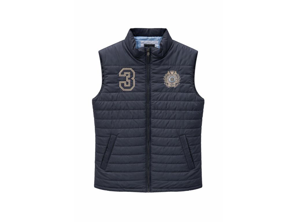 Lekhá prošívaná vesta v námořnicky modré barvě s výšivkami na hrudi.