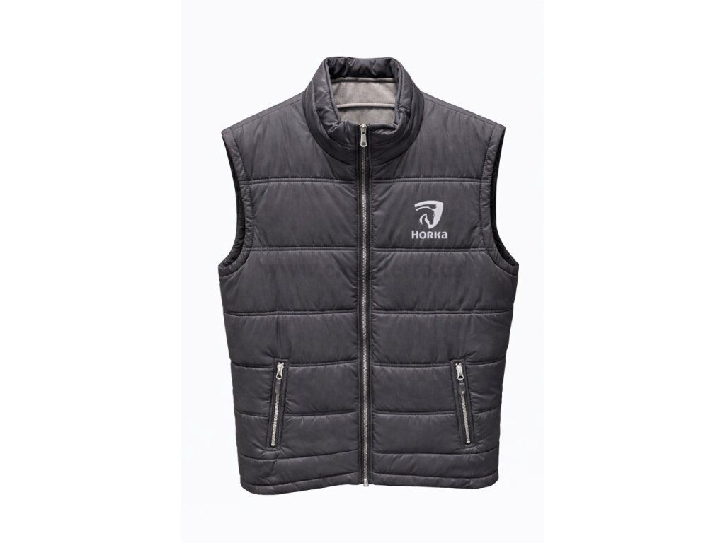Sportovní prošívaná vesta Practical v šedím provedení. Lehká zateplená konstrukce poskytuje tepelný komfort v chladnějším počasí. Vesta má vysoký stojáček proti větru, dvě boční kapsy na zip a decentní logo na hrudi. Vhodná do stáje, na trénink, turistiku i běžné nošení.