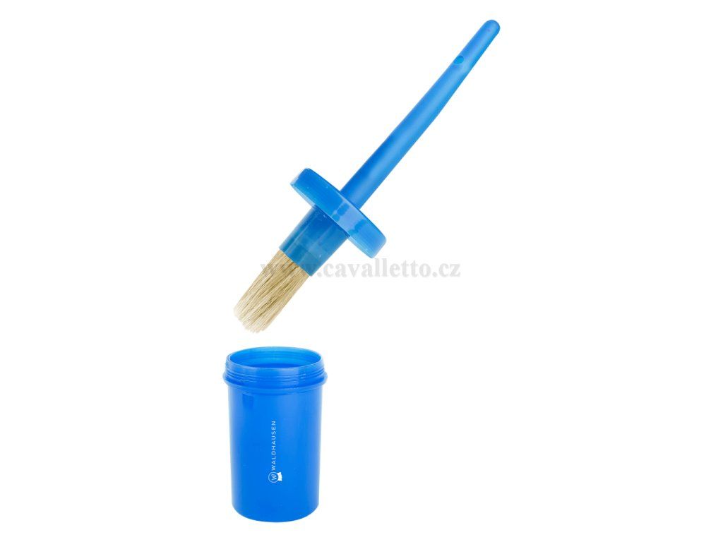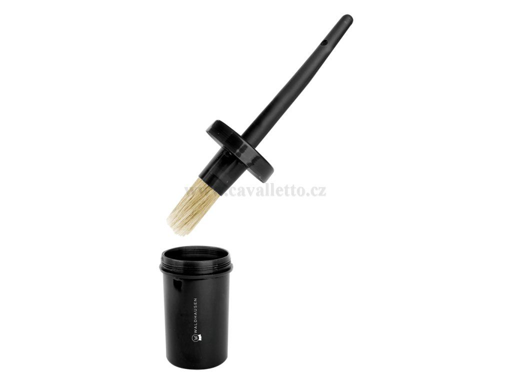 Kartáč na kopyta z měkkých vepřových štětin v plechovce pro čisté skladování a aplikaci.