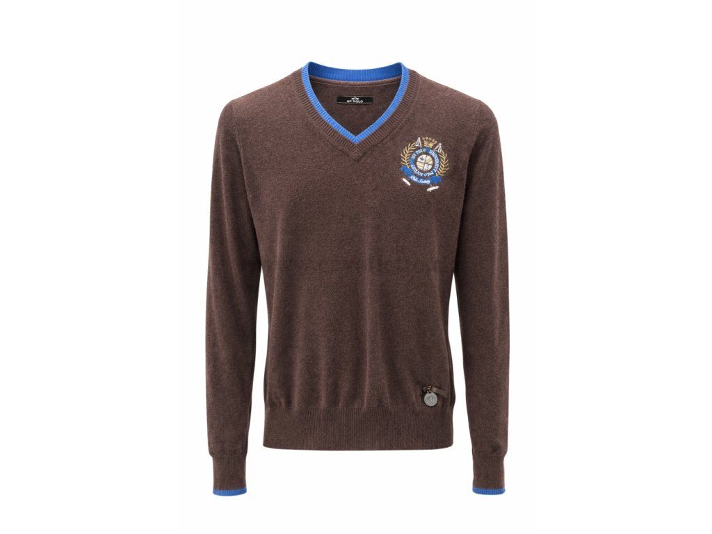 Stylový dámský svetr HV Polo v elegantní kombinaci hnědé a královské modré. Lehký, jemně pletený svetr s výstřihem do V, vhodný pro každodenní nošení i volnočasové aktivity v jezdeckém či preppy stylu.