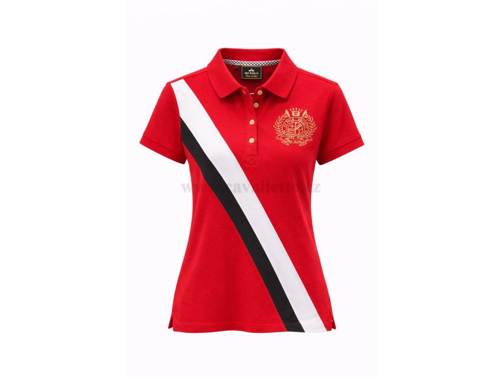 Stylové dámské polo tričko HV Polo society v energické červené barvě s charakteristickým jezdeckým vzhledem. Přední část zdobí kontrastní diagonální pruh v bílé a černé, které dodávají sportovně elegantní výraz.