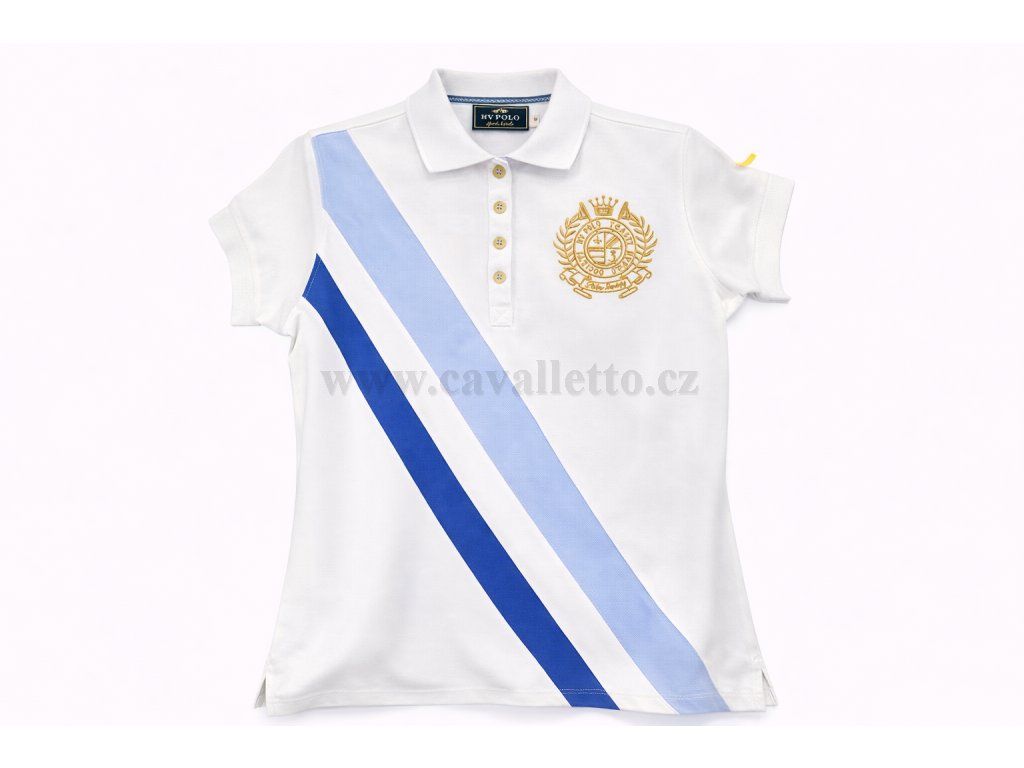 Bílé dámské tričko s elegantními diagonálními pruhy v modrých tónech. Výrazný zlatý erbový motiv na hrudi a dekorativná žluté knoflíčky dodávají tričku luxusní sportovní vzhled.