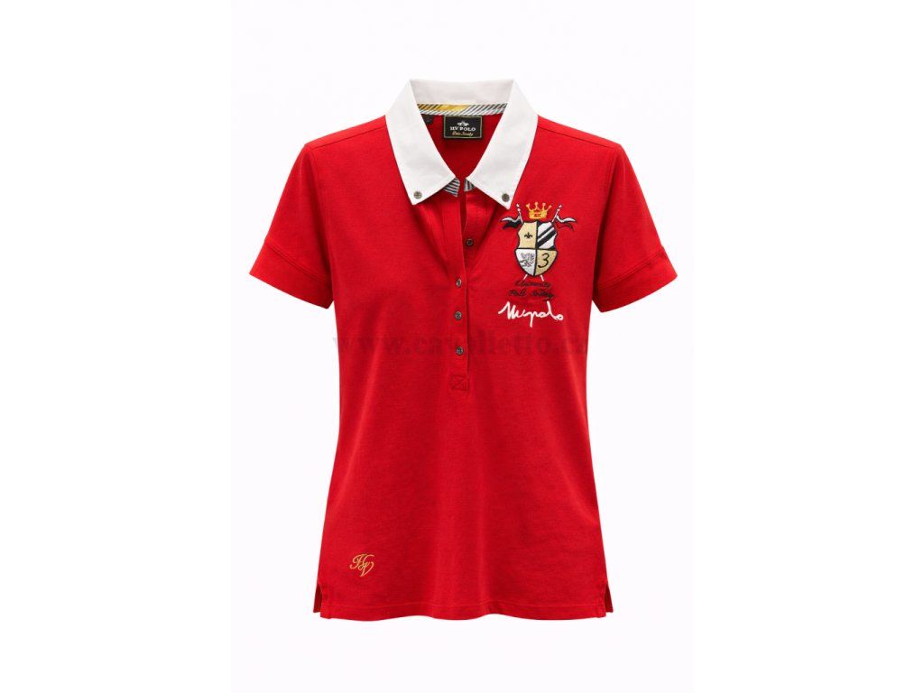 Dámské polo tričko HV Polo Society v elegantním červeném provedení s kontrastním bílým límečkem a bohatou výšivkou na hrudi. Ideální volba pro milovníky jezdeckého a preppy stylu.