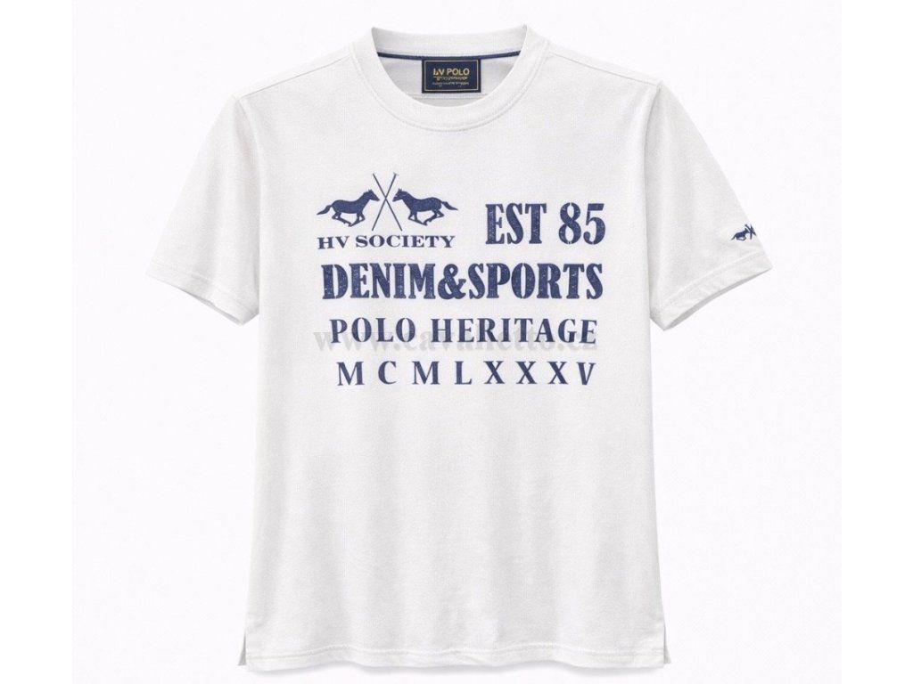 Bílé pánské tričko s modrým potiskem a nápisy ve stylu. Působí sportovně, pohodně a moderně.