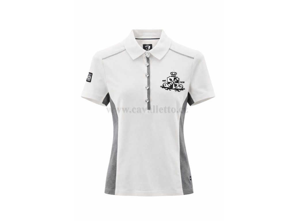 Dámské sportovní polo tričko značky Horka v elegantním jezdeckém stylu. Tričko je zhotovené v kombinaci bílé a šedé barvy a třpytek. Je vyrobeno z 95% bavĺna, 5% lycra. Vhodné pro každodenní nošení i sportovní aktivity.