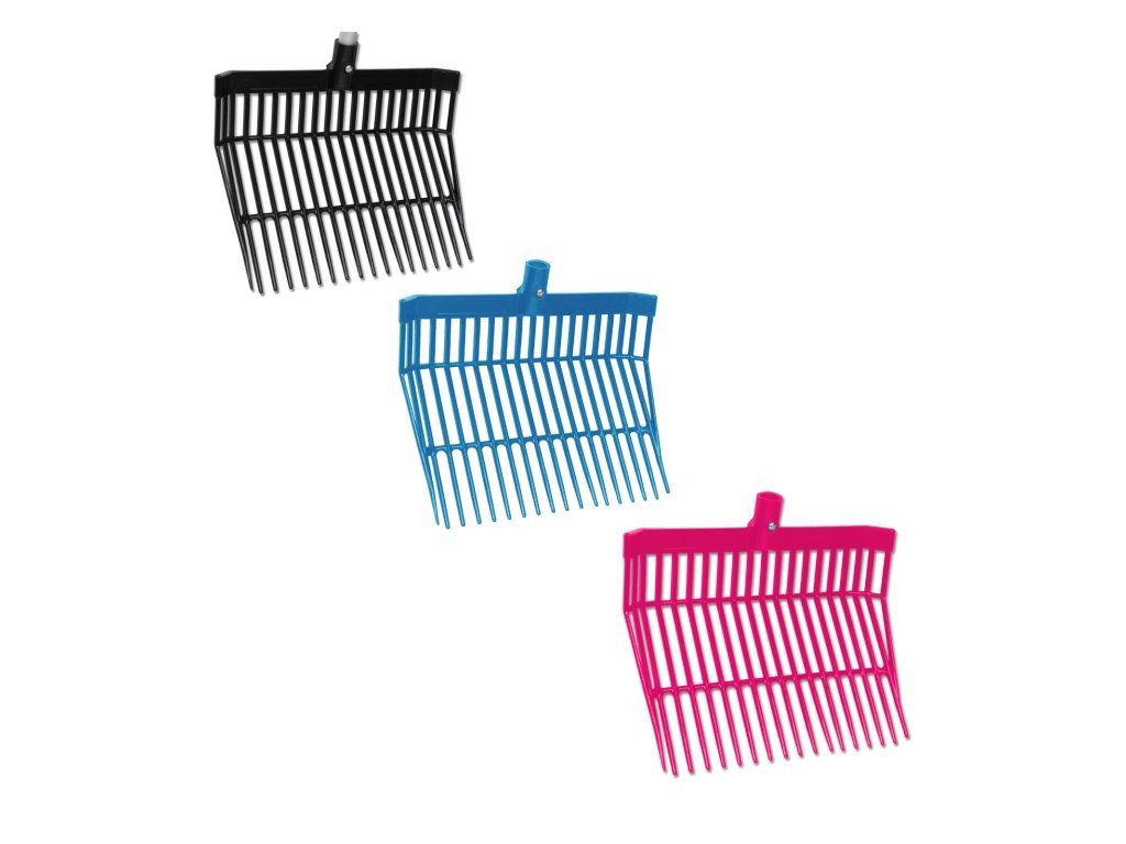 Vidle na hnůj vyrobené z odolného plastu pro snadné odstraňování hoblin a podestýlky. Boky jsou vyvýšené, aby se zabránilo vypadávání podestýlky. Rukojeť není součástí dodávky.